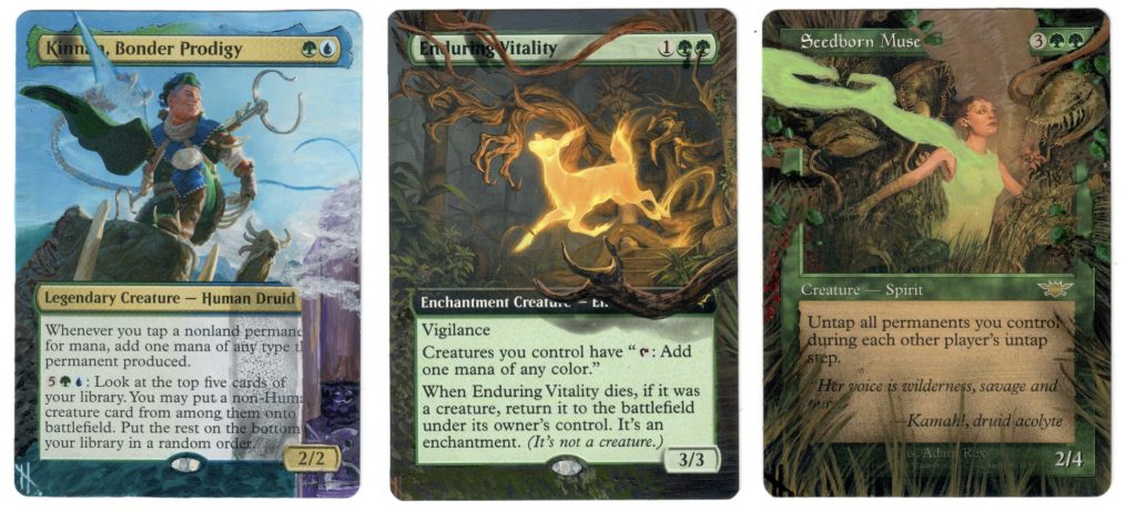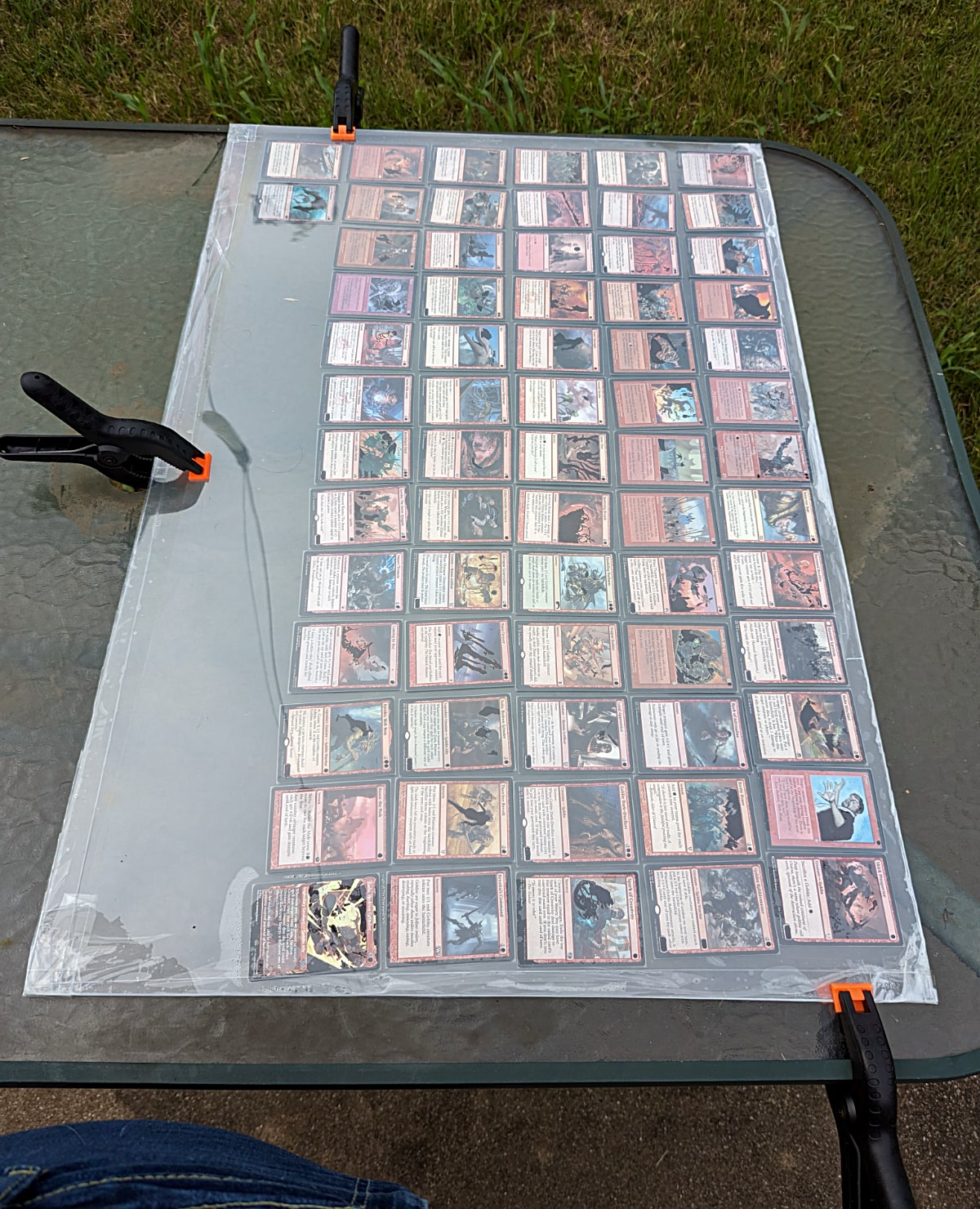 A selection of Nick V’s sunbleached cards for his Zada Commander deck. The colours are so surprising! (Right-click and “Open Image in New Tab” to see them up close.)